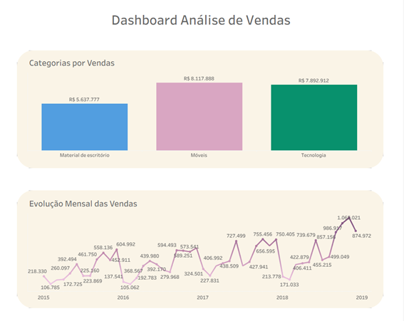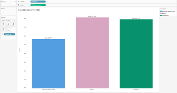 Crie um primeiro indicador chamado “Categoria por Vendas”. Inclua o campo Categoria em colunas e na marca cor e a medida Vendas em linhas e em rótulo.