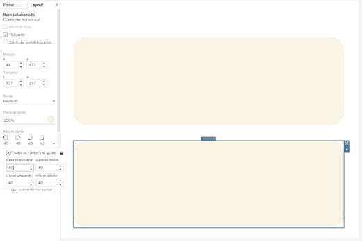 Selecione um contêiner, vá na aba layout e na opção raio de canto coloque 40. Faça o mesmo para o segundo contêiner.