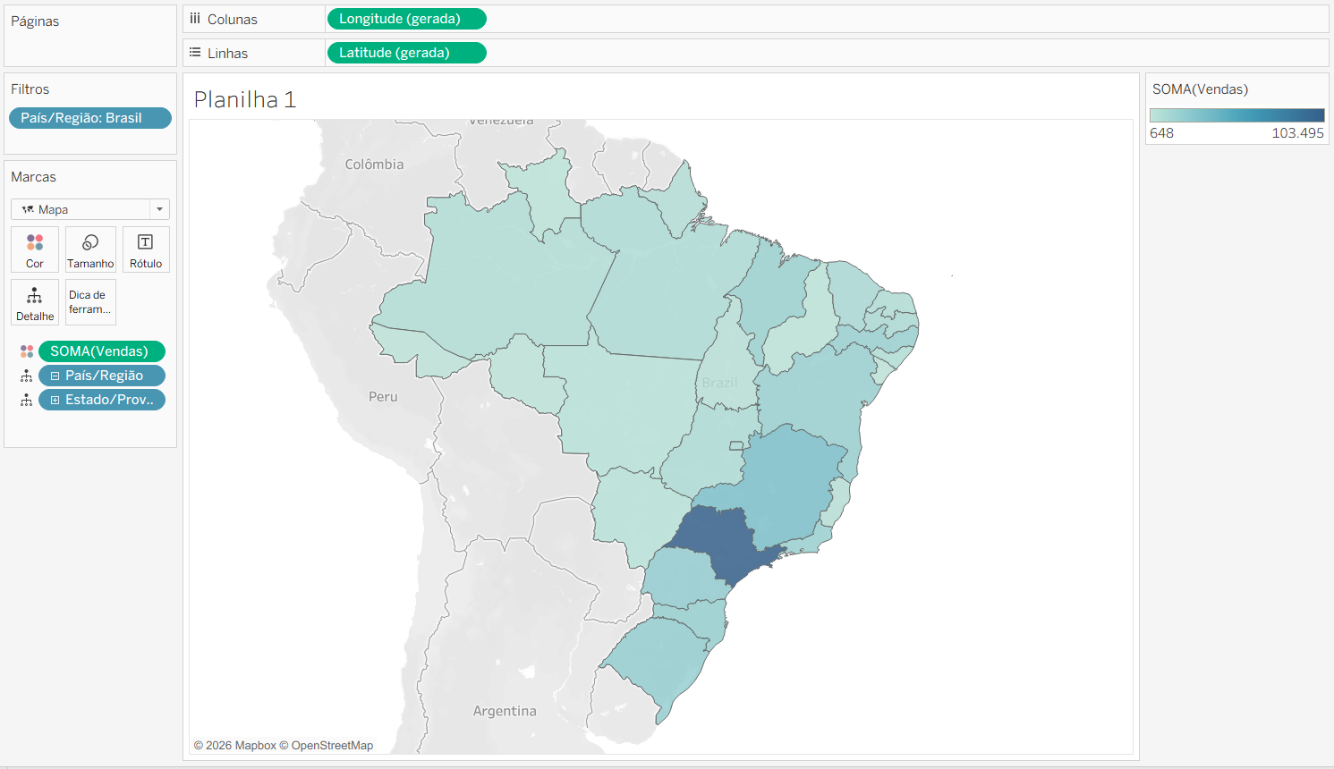 Vamos criar uma visualização mostrando o mapa do Brasil com os Estados coloridos de acordo com o valor de Vendas. Para isso, clique duas vezes na função geográfica País/Região para plotar o mapa. Em seguida, no campo de País/Região que está no cartão de marcas de Detalhe, abra a hierarquia para Estado/Província. Arraste País/Região para a divisória de filtros e selecione somente Brasil.