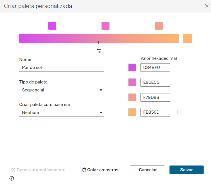 Para isso, clique na lista suspensa da opção Paletas sequenciais do menu, e escolha “criar paleta personalizada”