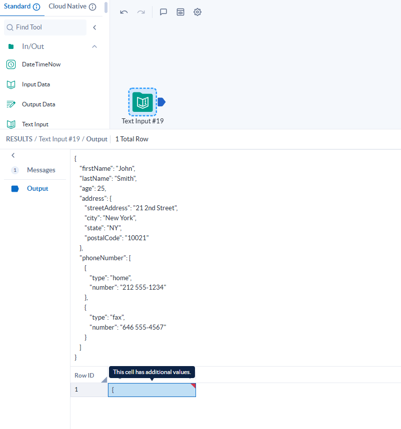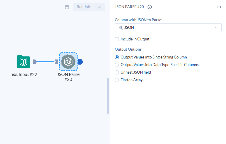- Column with JSON to Parse: Selecione a coluna que contém o texto JSON. A coluna deve conter um JSON válido com todo o texto em uma única célula, como mostrado acima. (Obs: se marcada a opção “Include in Output”, a coluna JSON selecionada é incluída no fluxo de dados que sai da ferramenta).