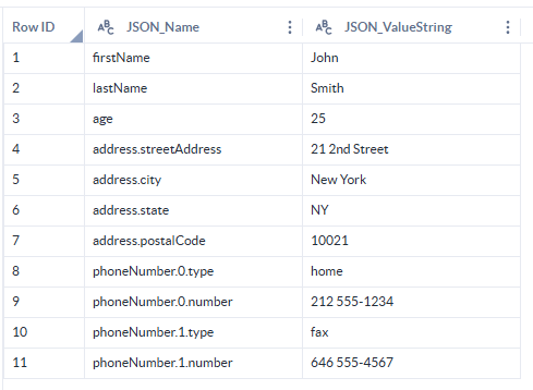 - Output Values into Data Type-Specific Columns: O JSON será transformado em várias colunas: JSON Name, e os valores serão distribuídos como colunas de string, inteiro, duplo e booleano com base no tipo de dados JSON.