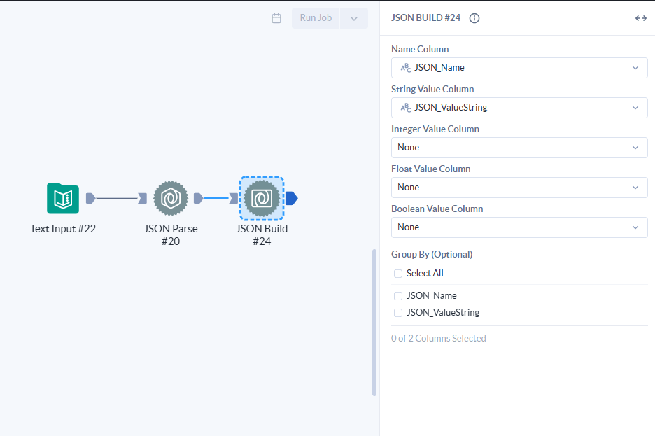 Para transformar nossos dados de volta em JSON usando essa ferramenta, precisamos selecionar a coluna “JSON_Name” em Name Column e, como temos apenas uma coluna do tipo string com nossos valores, a “JSON_ValueString”, vamos seleciona-la em String Value Column.