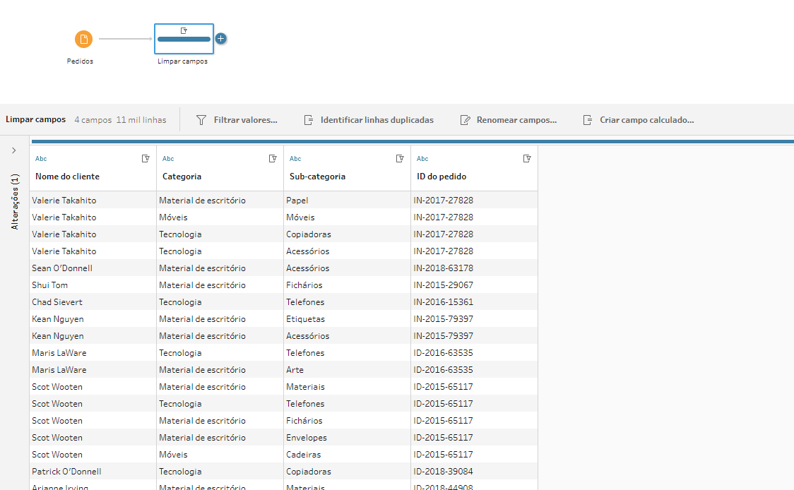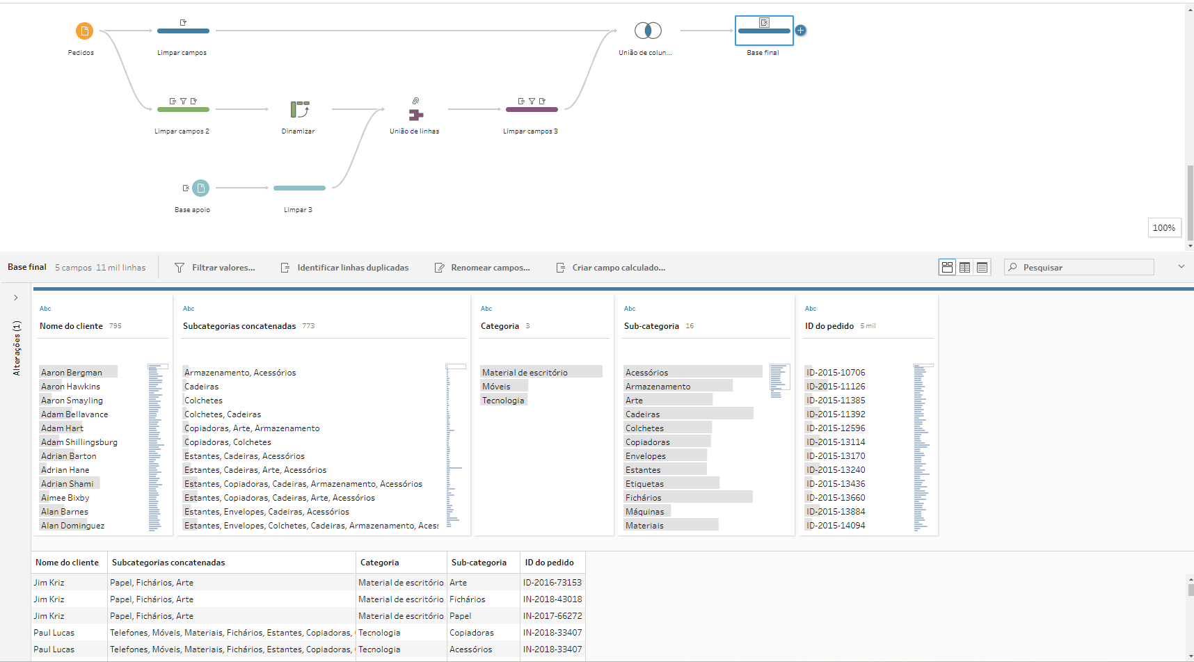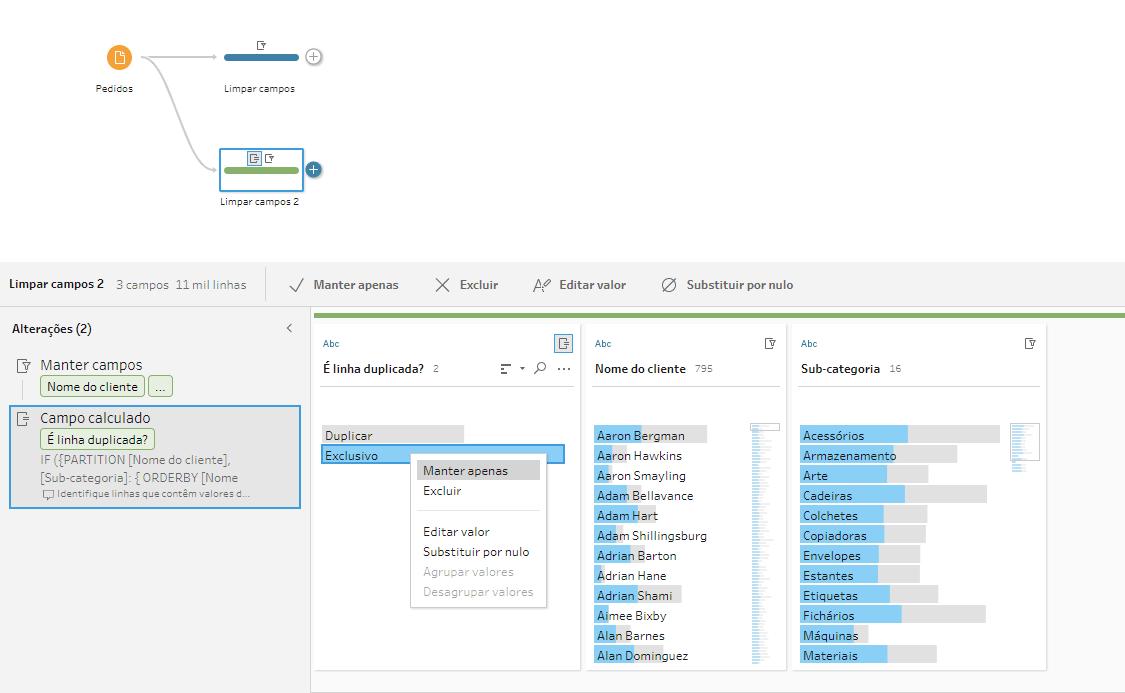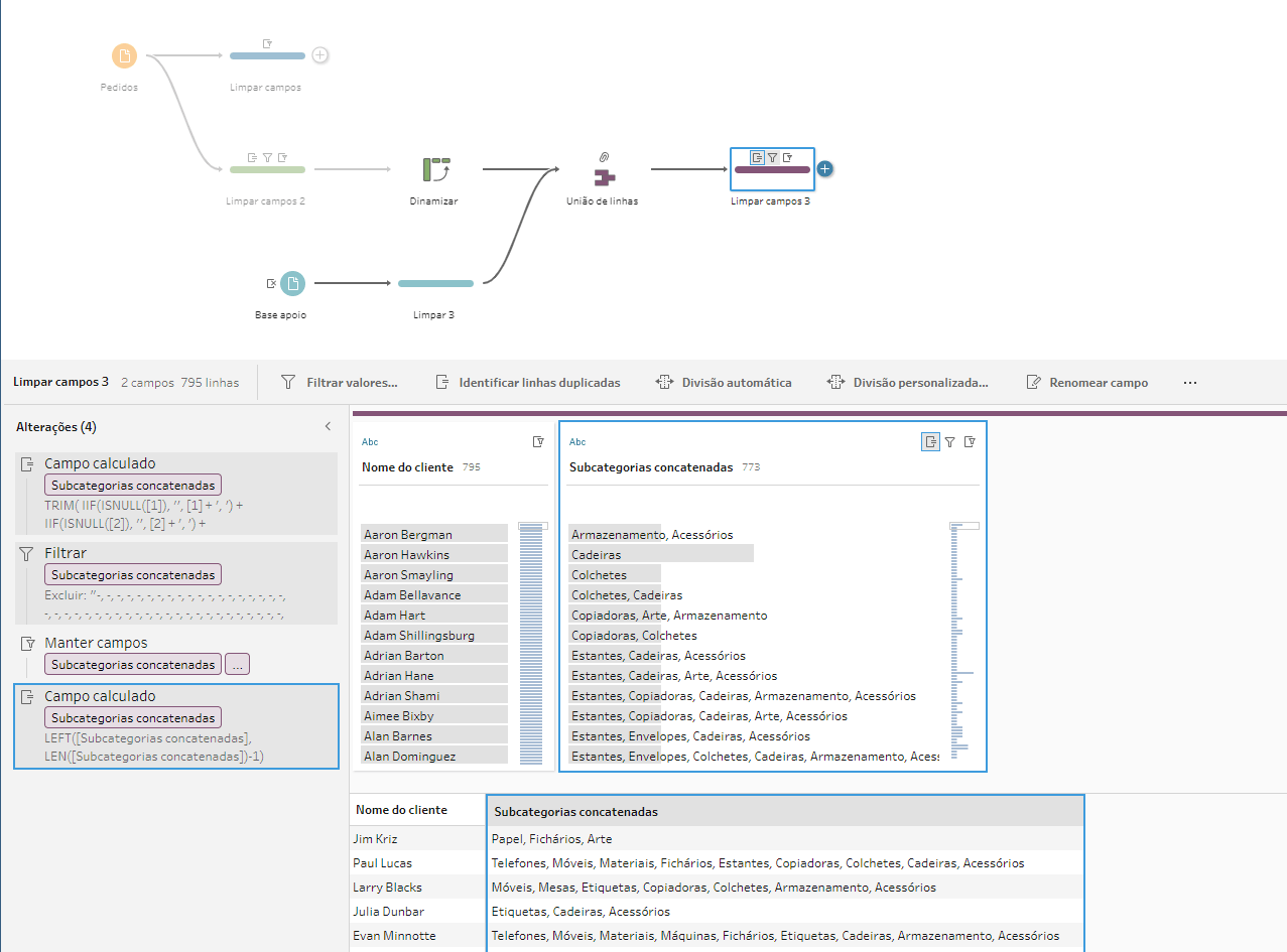 Vamos criar uma bifurcação para realizarmos essa análise, precisaremos manter apenas os campos Nome do Cliente e Subcategoria. Após isso, vamos clicar em “identificar linhas duplicadas” para não termos linhas repetidas de clientes e subcategorias, pois isso resultaria em subcategorias repetidas na lista final caso o cliente tivesse feito mais de uma compra nela. Vamos manter apenas os casos “Exclusivos”. Já fizemos uma dica em como identificar linhas duplicadas! Clique aqui para ver.