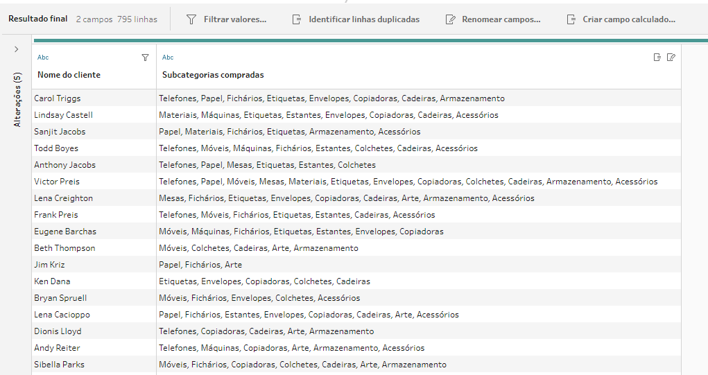 Podemos ver que cada compra pertence a uma categoria e subcategoria. Nosso objetivo será criar um campo que irá concatenar todas as subcategorias que cada cliente já comprou, separado por vírgulas, seguindo esse formato: