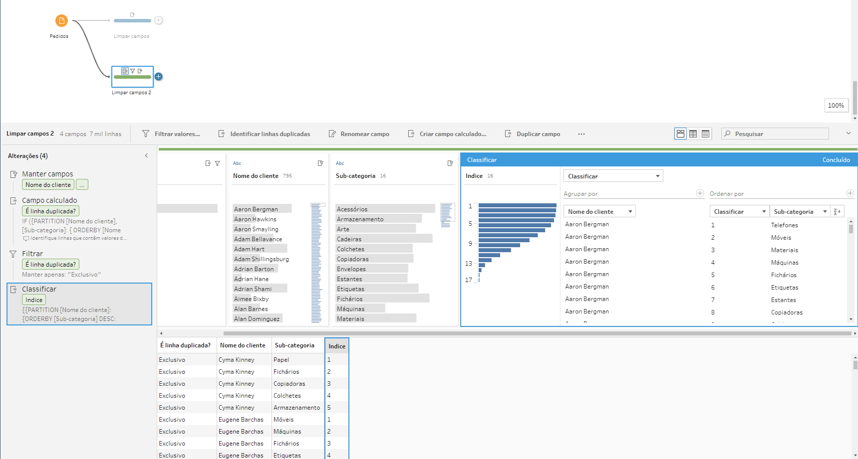Vamos precisar criar um índice numérico para cada subcategoria de cada cliente, para isso, vamos utilizar um cálculo de classificar. Clicamos em ‘…’ na coluna subcategoria, depois em “Criar campo calculado” e em “Classificar”. Vamos agrupar nossa classificação por Nome do cliente, para o índice reiniciar a cada novo cliente, como podemos ver abaixo: