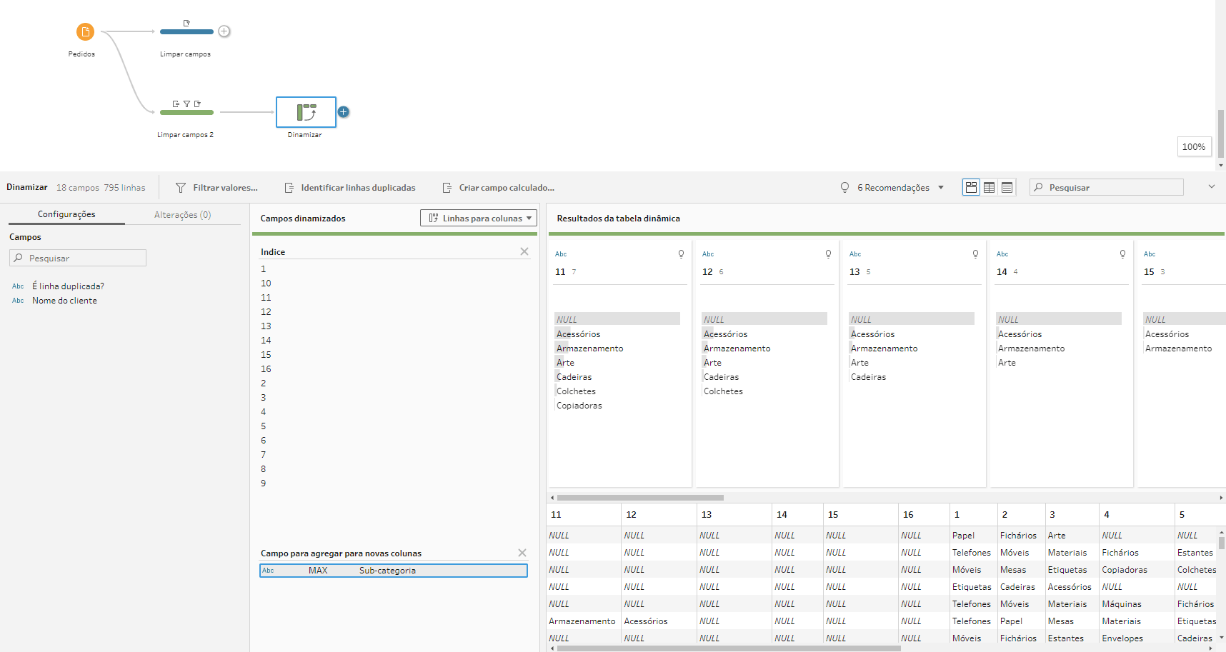 Vamos precisar dinamizar essas linhas de Índice para coluna, para isso vamos trazer uma ferramenta de Dinamizar, trocar para “Linhas para colunas” e levar a coluna “Indice” para a parte de cima “Campo que dinamizará linhas em colunas” e a coluna “Subcategoria” para a parte de baixo “Campo para agregar para novas colunas”. Troque a agregação da Subcategoria para “Máximo”: