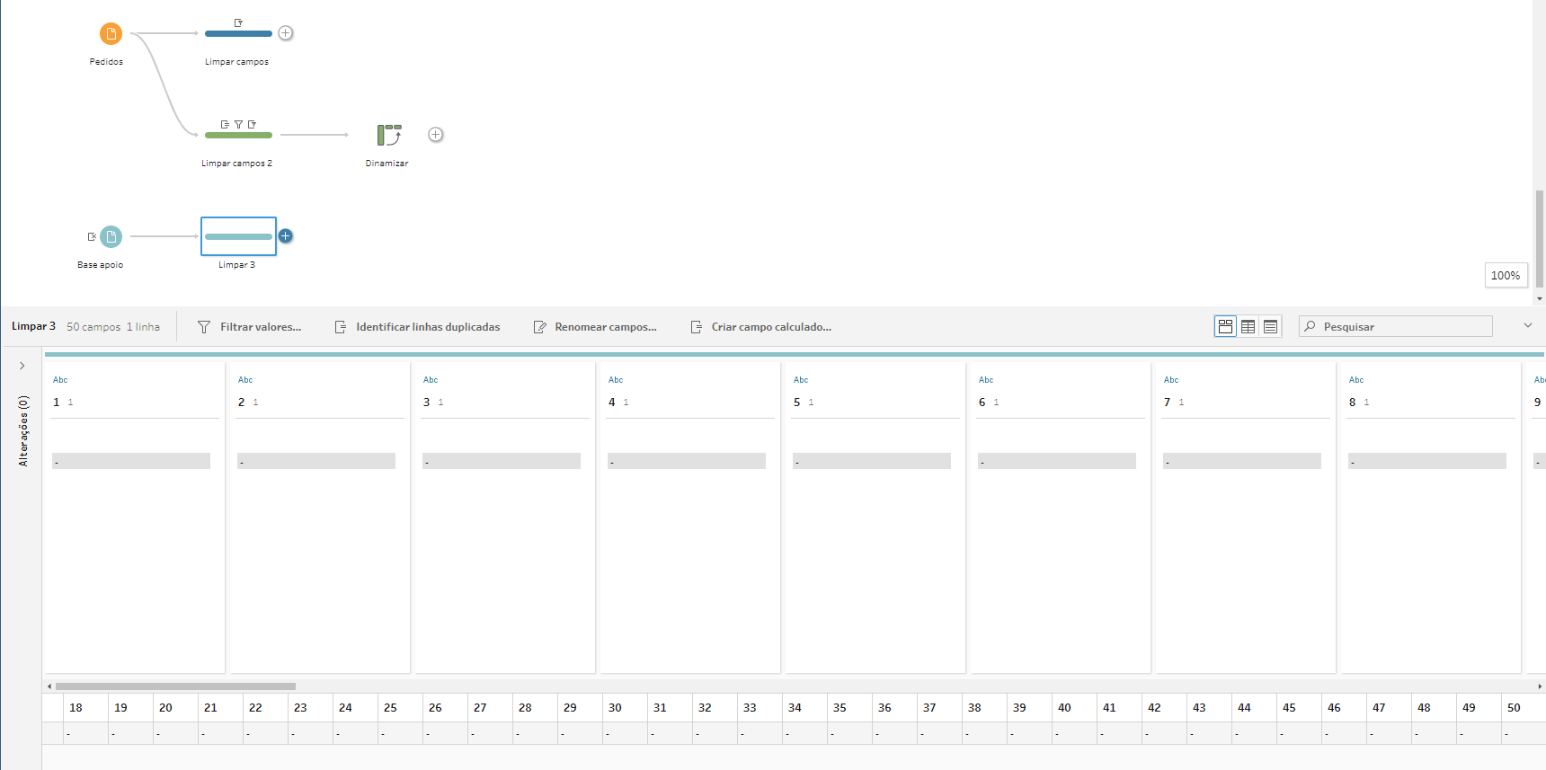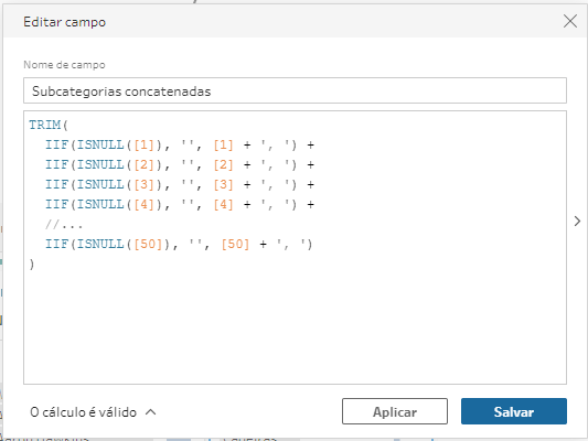 Chegamos na reta final do nosso fluxo! Vamos finalmente concatenar os valores, agora que estão todos nas mesmas linhas. Por causa do passo anterior, sabemos que é necessário concatenar as 50 colunas resultantes da união. Mesmo que o número de subcategorias de um cliente não chegue a 50, é importante concatenar todas as colunas para garantir que nenhuma subcategoria seja omitida. Então, vamos precisar criar um longo campo calculado concatenando todas as colunas: