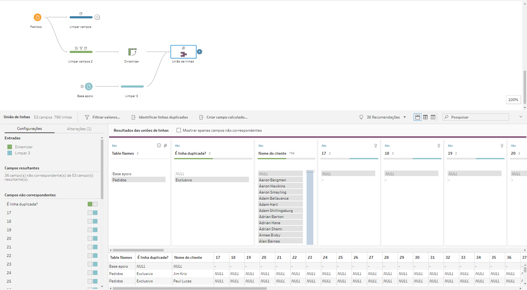 Por último, precisamos juntar essa coluna com nossa base original utilizando uma etapa de União de Colunas e usando Nome do Cliente como chave da união.