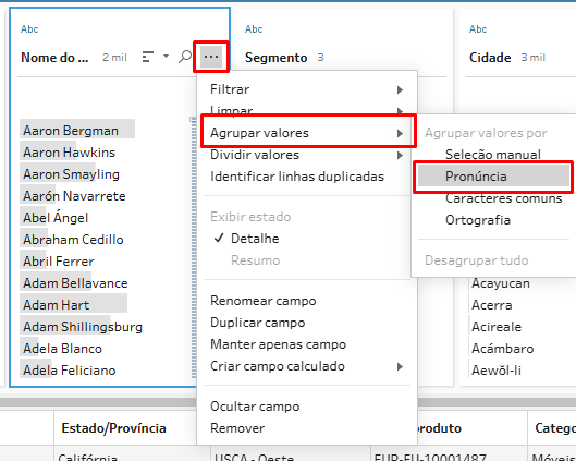 - O Tableau Prep abrirá o editor de agrupamento. Em vez de selecionar manualmente, vamos usar a inteligência da ferramenta.