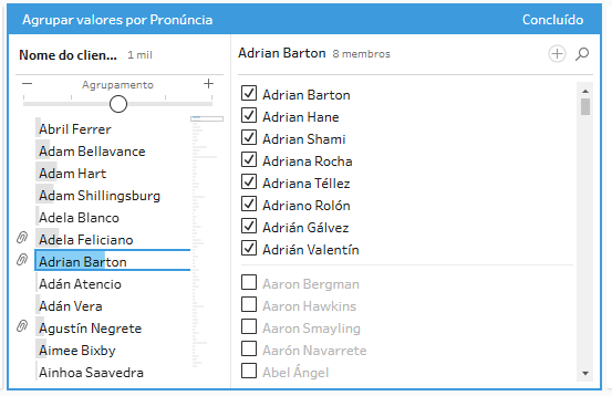 - O Tableau Prep mostrará os valores que ele agrupou. Por exemplo, ele pode juntar “Adrian Barton”, “Adrian Hane” e “Adrian Shami” (todos os nomes que fazem lembrar a pronúncia de Adrian) em um único grupo.