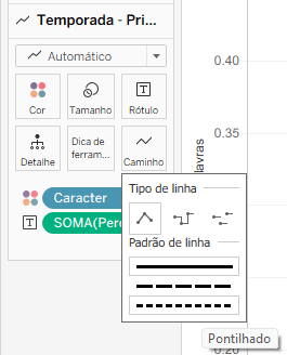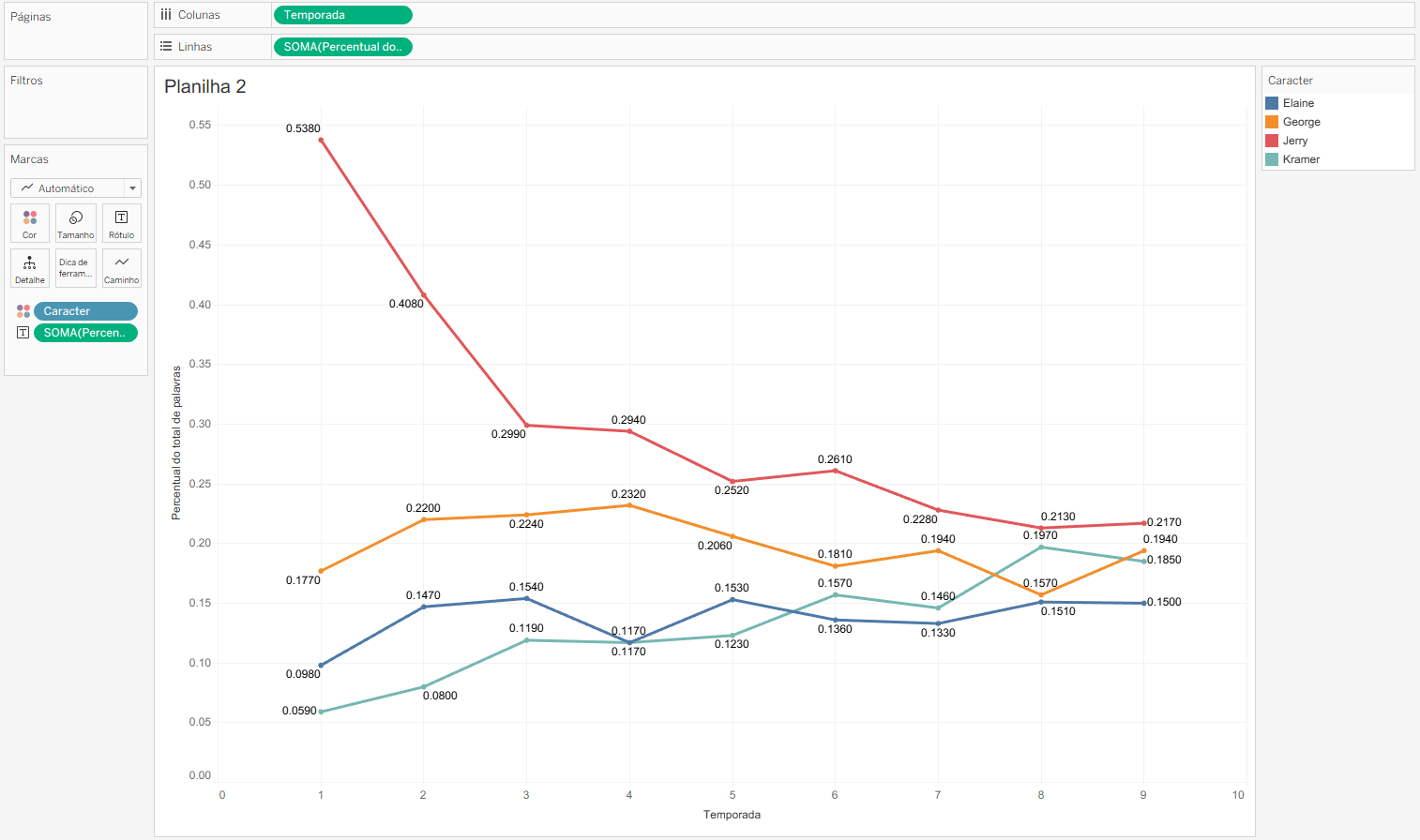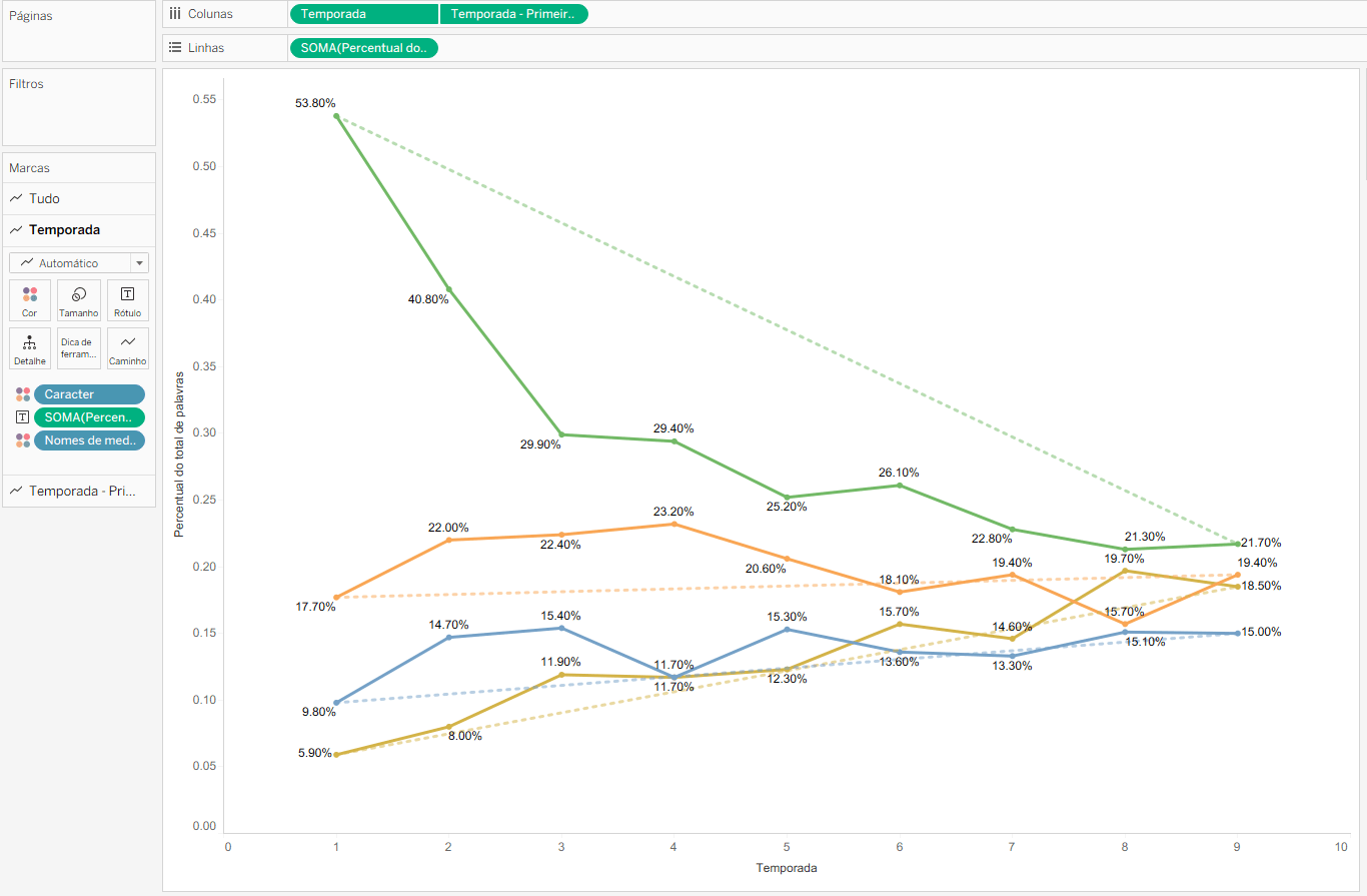 Primeiro crie um gráfico de linhas comum. Para isso, arraste o campo Temporada para colunas e a medida Percentual do total de palavras para linhas e rótulo. Inclua o campo Caracter na marca cor.