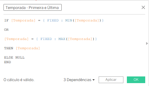Crie um campo calculado que utilize LODs FIXED para capturar apenas o primeiro e o último valores do eixo X, nesse caso, o eixo de Temporada.