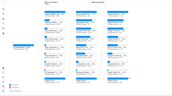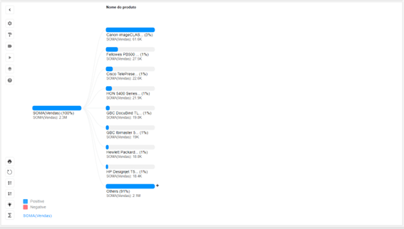 Passo 3: Para criar nosso gráfico, arraste a dimensão nome do produto para “dimensions” e Vendas para “Measures”. Após isto, selecione o sinal de + e clique para adicionar os produtos, conforme imagens abaixo: