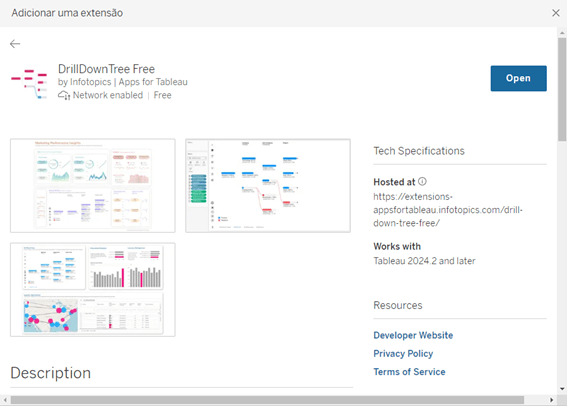 Passo 1: Abra uma planilha nova e, no cartão de marcas, selecione “Adicionar extensão”. Abrirá uma caixa com diversas extensões. Va na “Busca” à esquerda superior e digite “Tree”. Clique na extensão “DrillDown Tree”. Em seguida, clique no botão azul “Open” à direita superior, e na caixa “Permitir extensão” clique em “OK”.