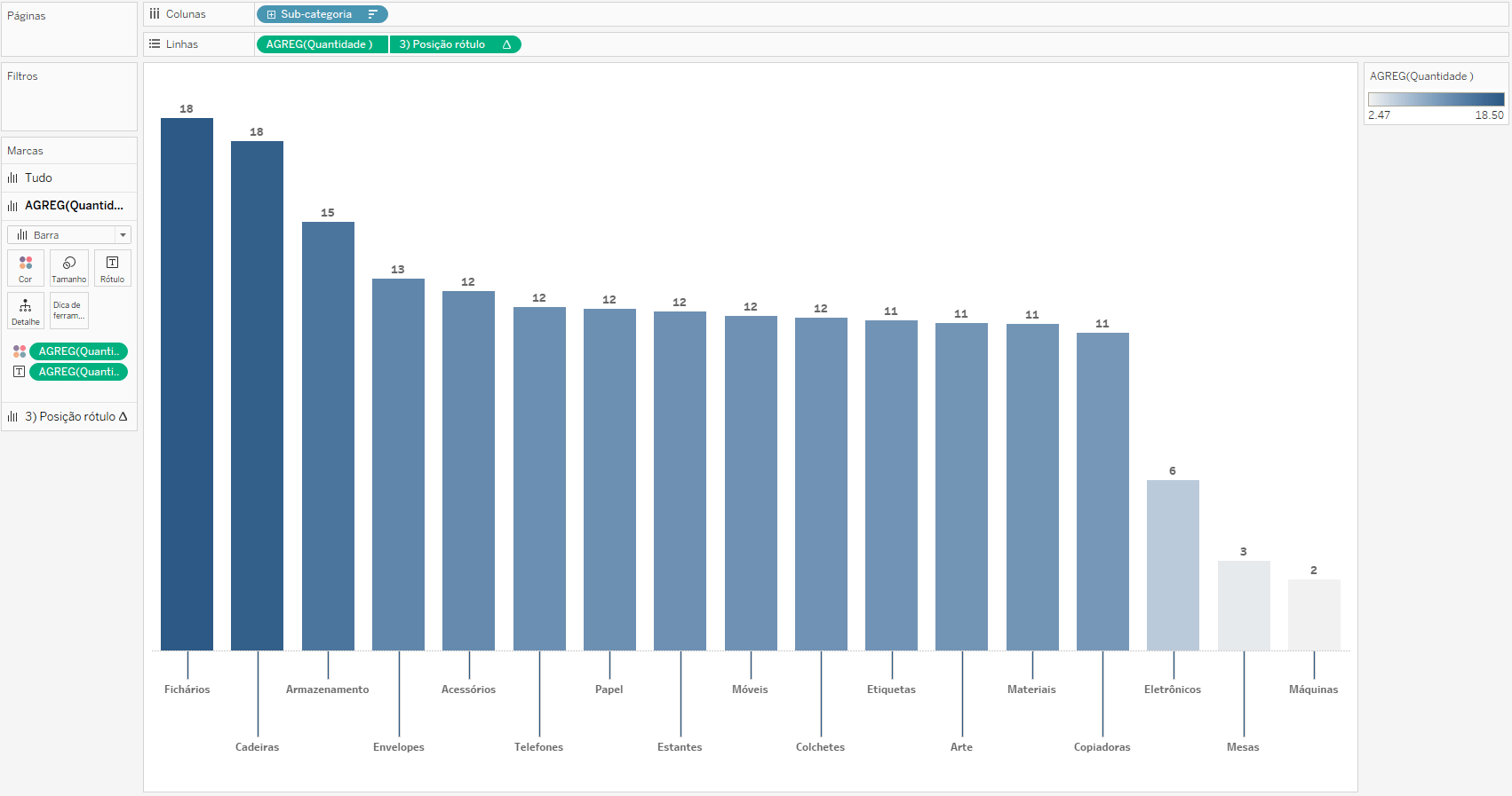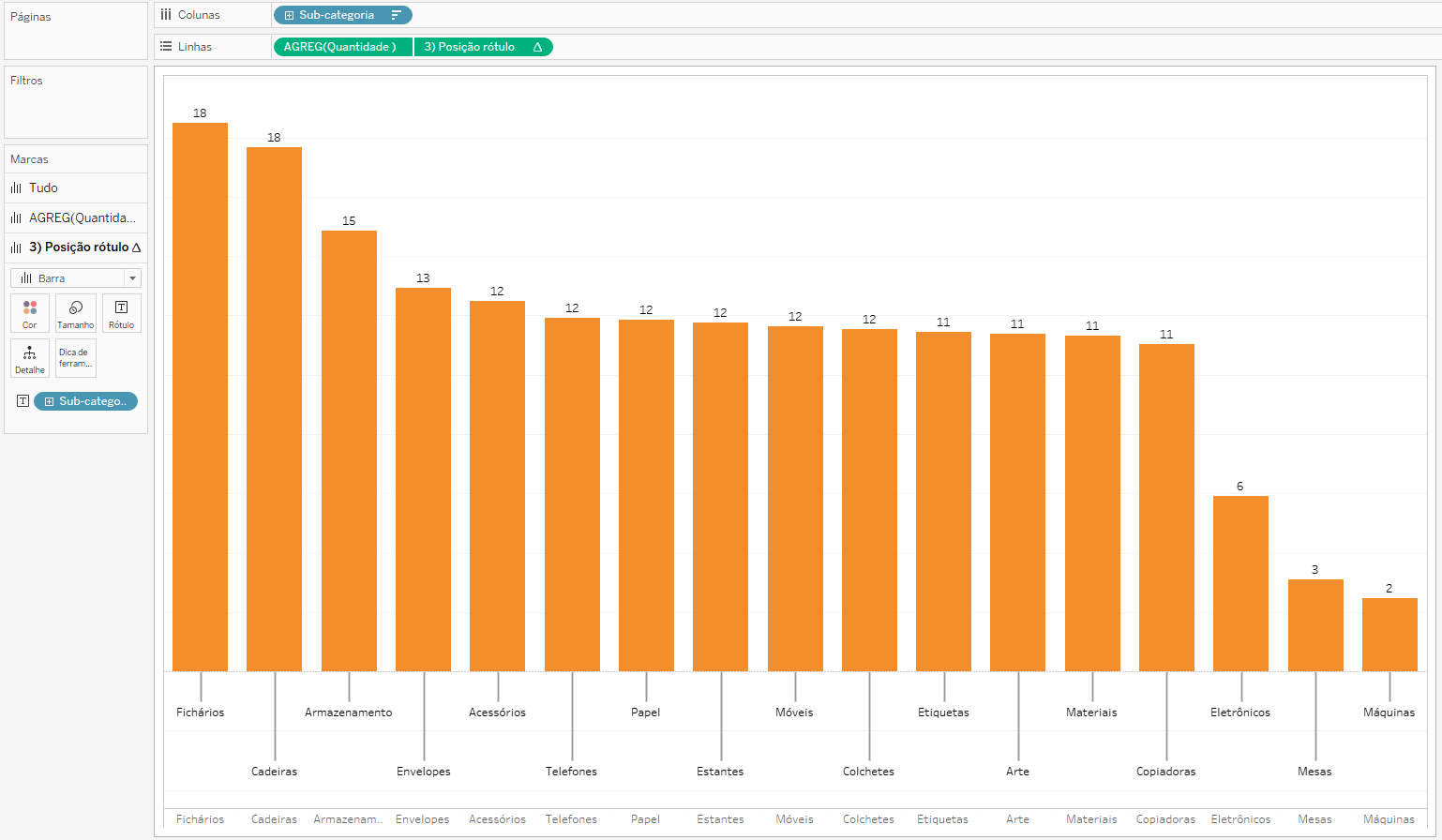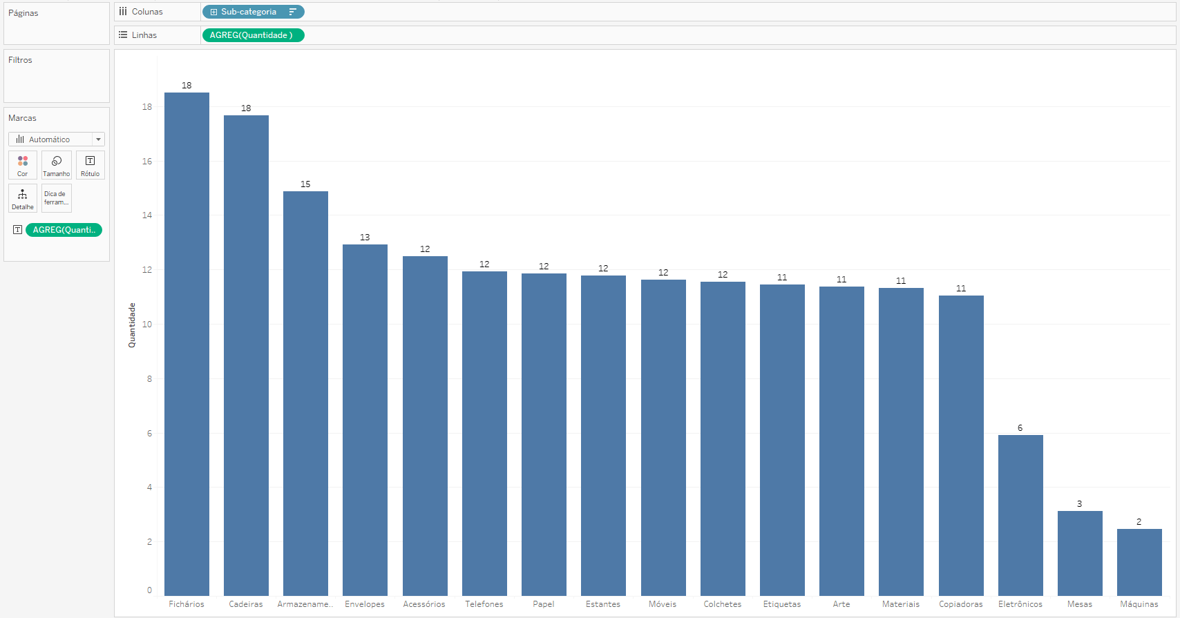Crie um gráfico de barras arrastando a medida Quantidade para Linhas e rótulo e a dimensão Sub-categoria para colunas. Em seguida, clique no botão de ordenar decrescente.