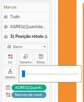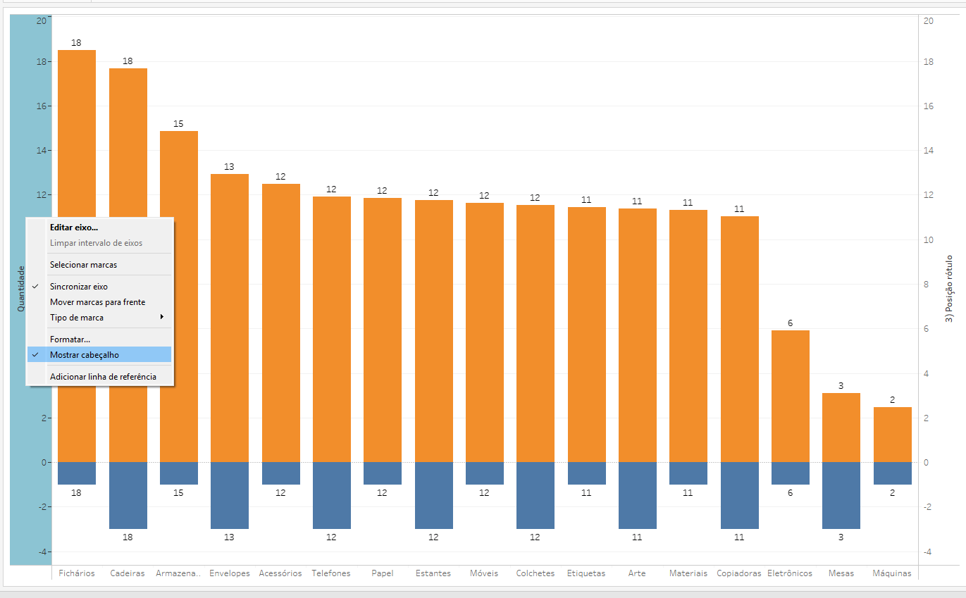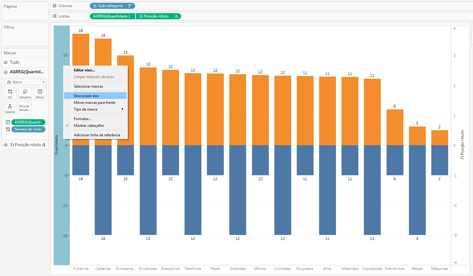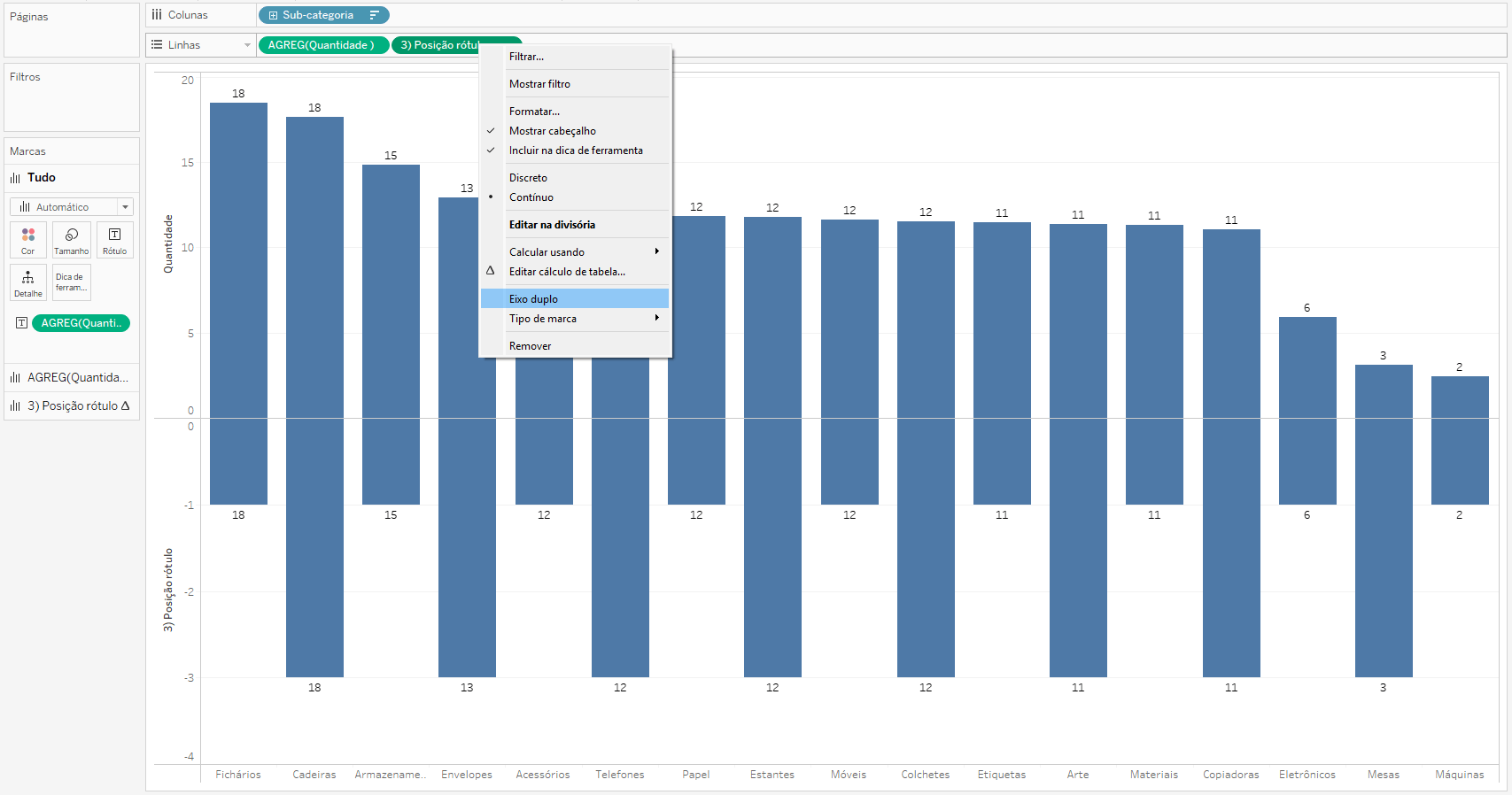 Posicione o campo “Posição rótulo” em linhas ao lado da medida Quantidade. Em seguida, clique com o botão direito do mouse e selecione Eixo Duplo.