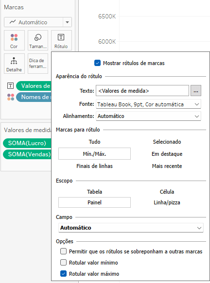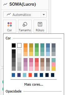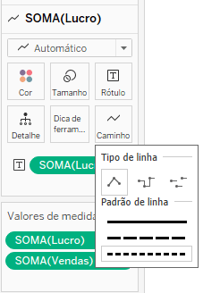 Repare que o Tableau criou um novo cartão de marcas para Lucro. Retire a Valores de medida da marca rótulo e inclua a medida Lucro. Retire também o campo Nomes de medida da marca cor.