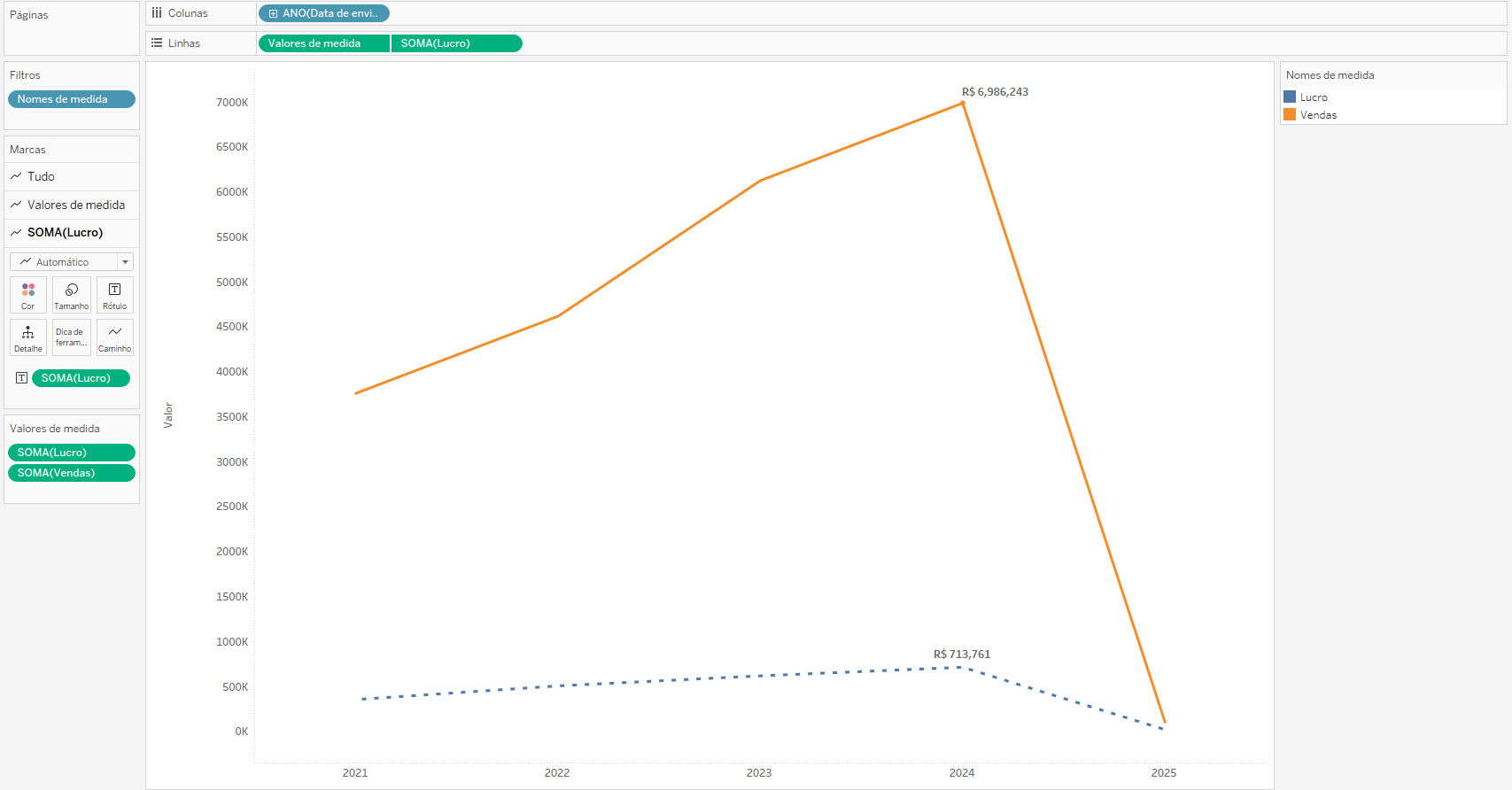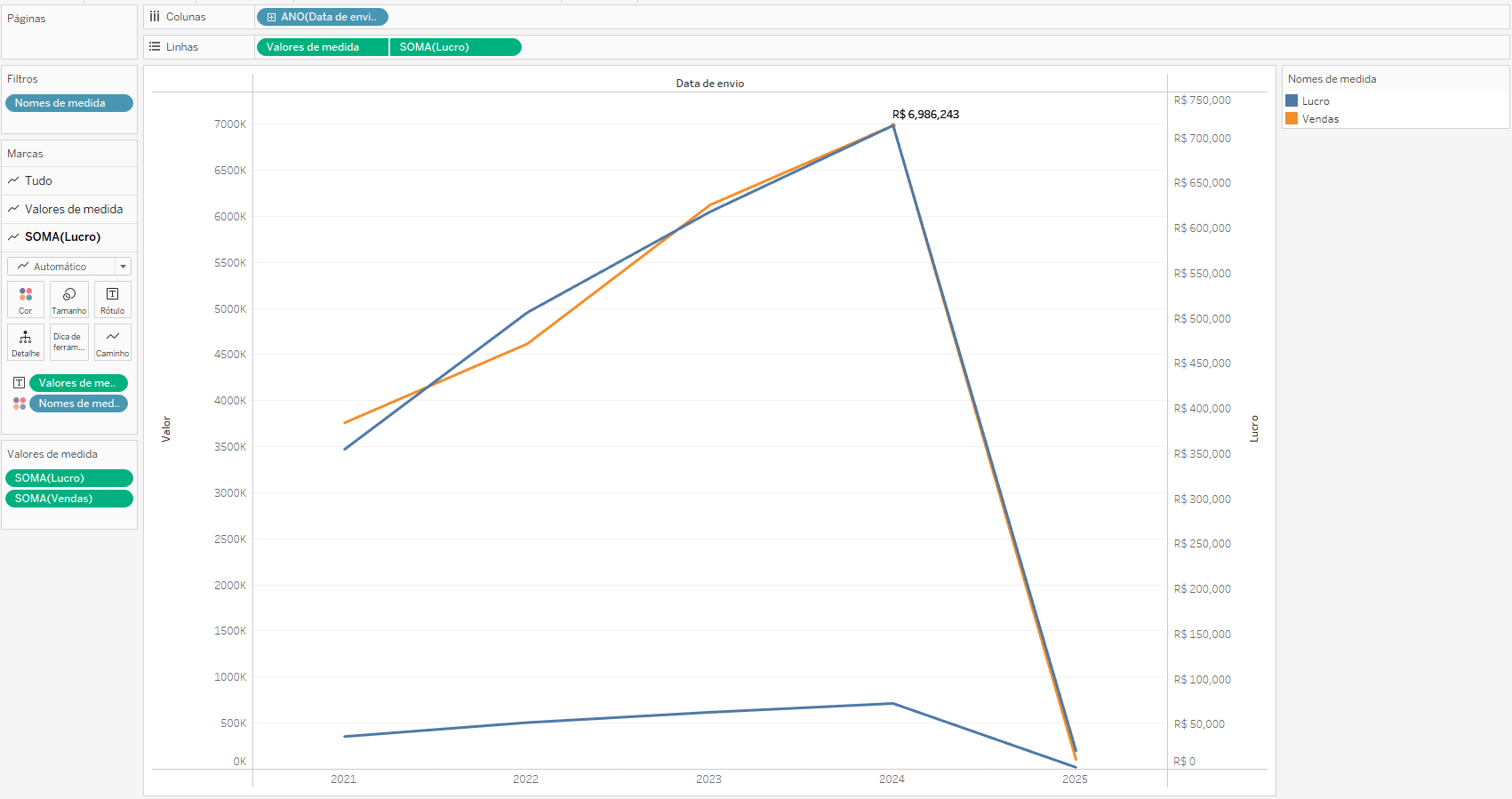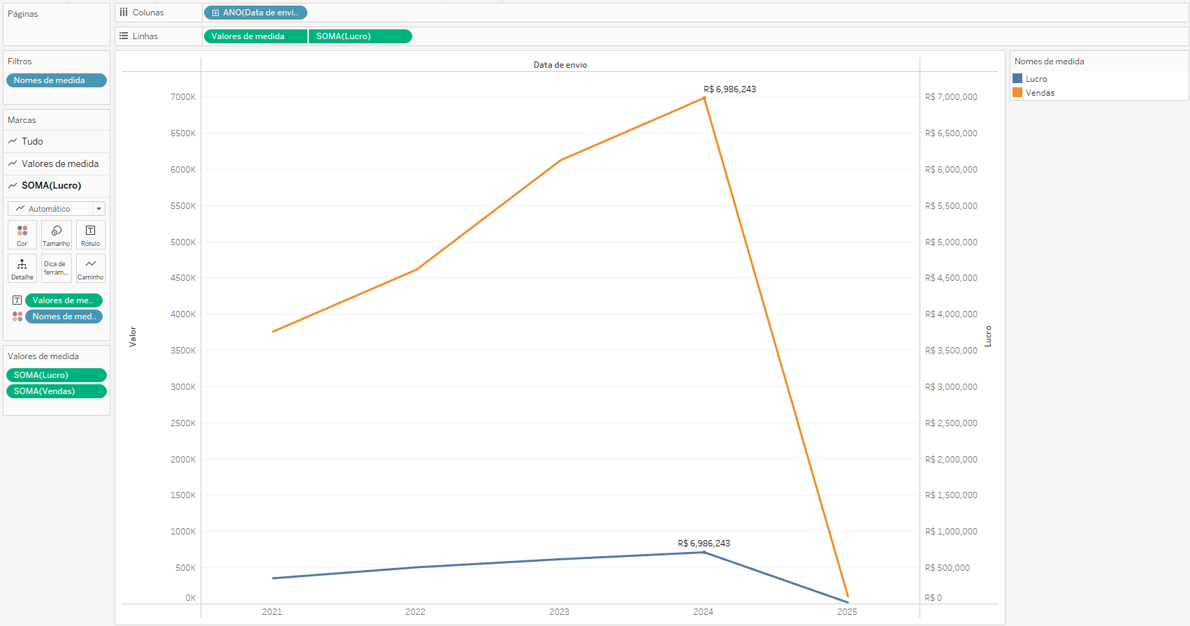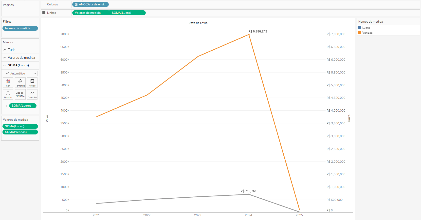 Crie um gráfico de linhas de eixo combinado que mostre as Vendas e Lucro por ano. Para isso, arraste a dimensão Data de envio para colunas agregado em Ano. Depois, arraste a medida Vendas para linhas e em seguida, arraste a medida Lucro para cima do eixo de Vendas. Repare que o Tableau irá incluir o campo valores de medida em linhas e nomes de medida na marca cor de forma automática.
