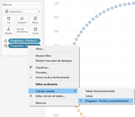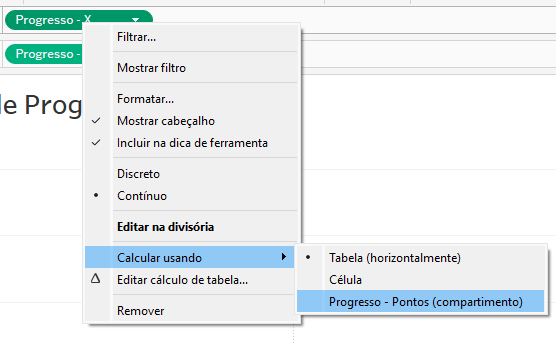 Clique com o botão direito do mouse sobre o campo “Progresso – X” que está em colunas e na opção de “Calcular usando” selecione o compartimento criado anteriormente, repita o mesmo procedimento com o campo que está na bandeja de linhas.
