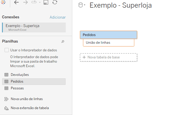 Na aba Fonte de Dados Arraste a tabela de pedido para criar uma união de linhas.