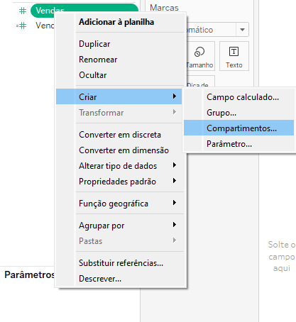 Passo 1: Clique com o botão direito do mouse no campo Vendas e selecione criar compartimentos. Após isto, coloque o tamanho do compartimento como 1000, conforme imagem abaixo: