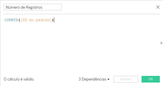 Passo 2: Crie um campo calculado chamado “Número de Registros” conforme imagem abaixo: