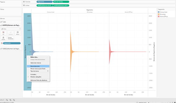 Passo 4: Arraste Segmento para Colunas e para marca Cor. Após isto, arraste Bin de Vendas e Número de Registros para Linhas, conforme imagem a seguir: