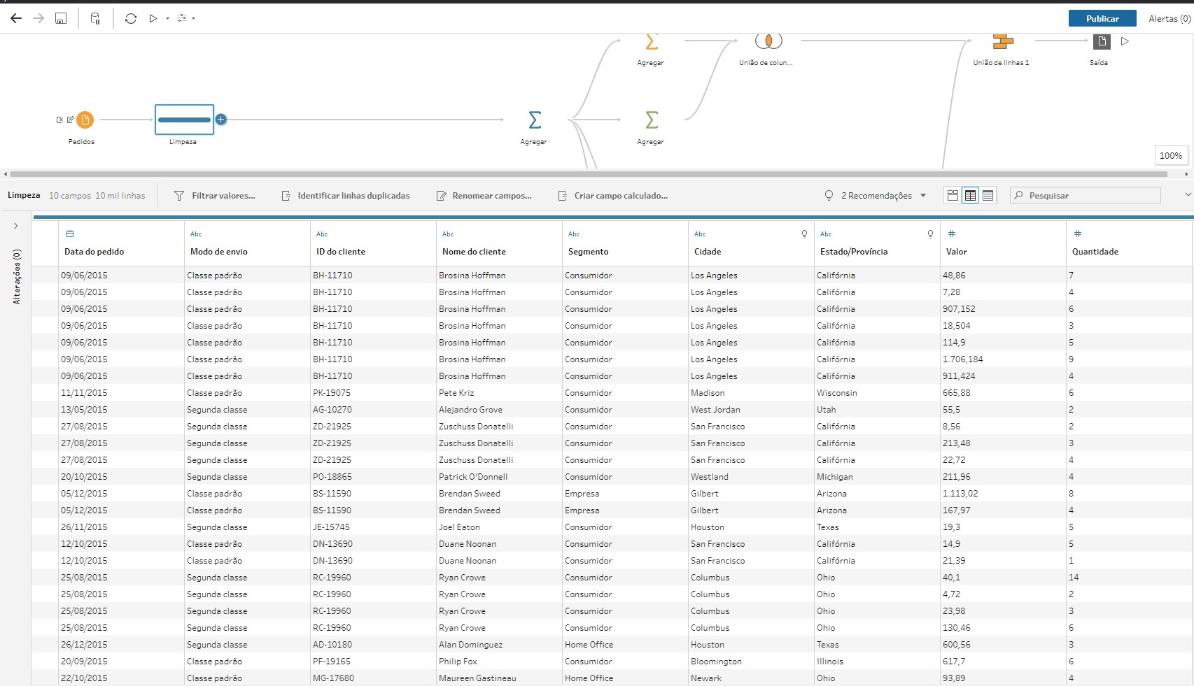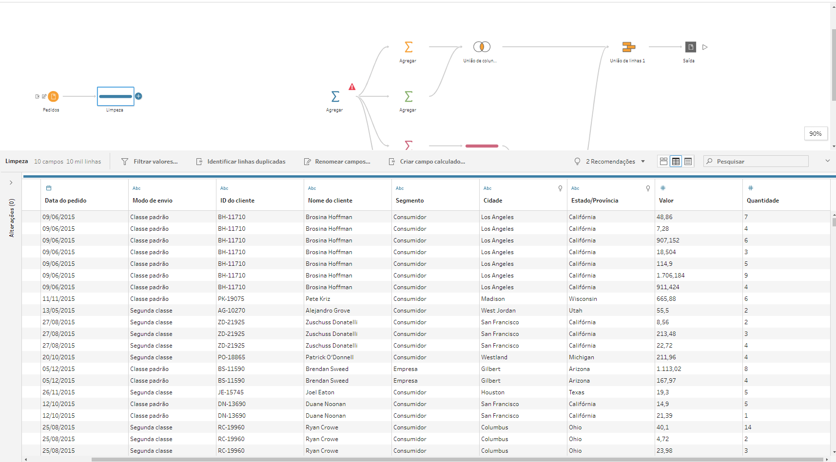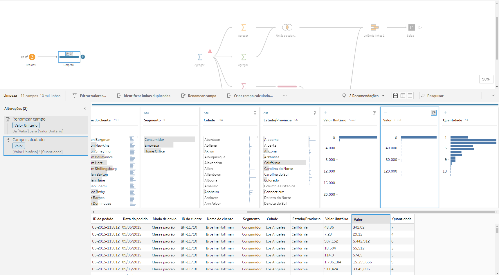O Tableau Prep irá reconhecer o novo esquema que sai da etapa de limpeza, mas como o campo principal permaneceu com o nome Valor, nenhuma etapa posterior precisará ser modificada. E esse é o fluxo final:
