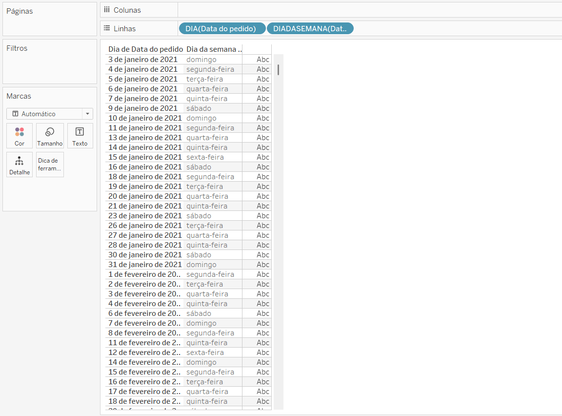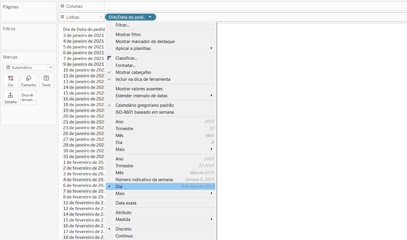 Passo 1: Abra uma planilha nova e, arraste o campo “Data do pedido” para linhas. Clique com o botão direito do mouse na pílula e selecione “Dia” na segunda sessão e em seguida selecione a opção “Discreto”.