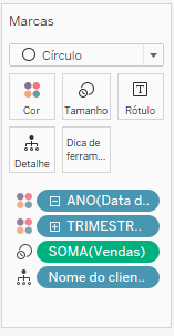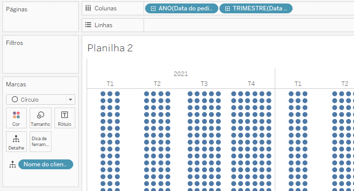 Vamos criar um gráfico de círculo com as seguintes configurações: Ano e trimestre na bandeja de colunas e o campo nome do cliente em Detalhe.