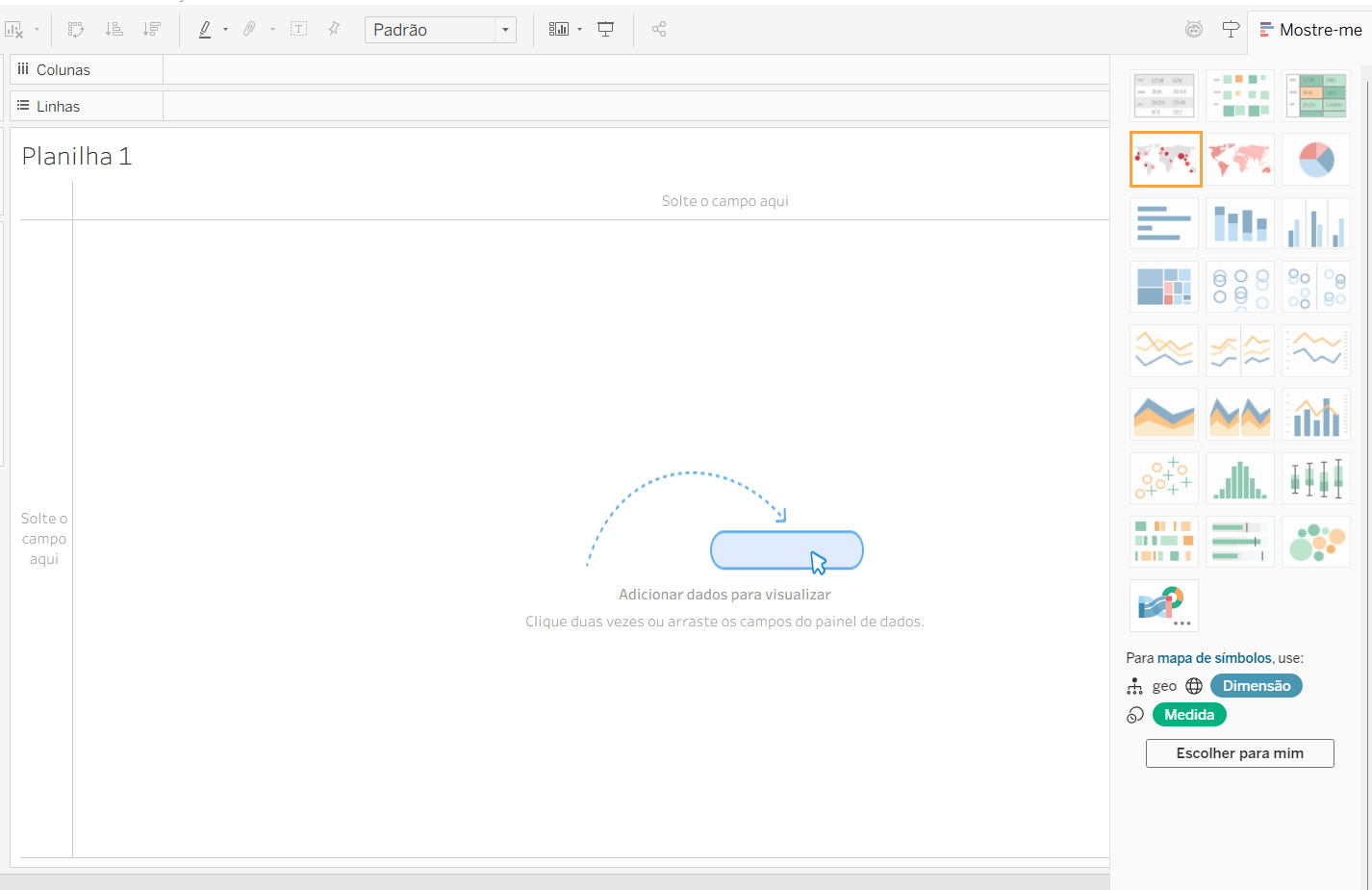 Antes, era necessário ter a combinação correta de dimensões e medidas na sua visualização para selecionar um gráfico do Mostre-me, mas a nova opção “Escolher para mim” fará uma estimativa sobre quais campos você pode querer usar para este gráfico. Por exemplo, vamos escolher a opção mapa de símbolos e clicar em “Escolher para mim”.