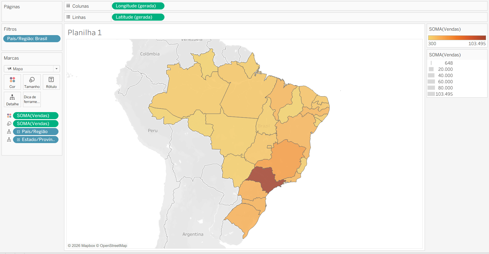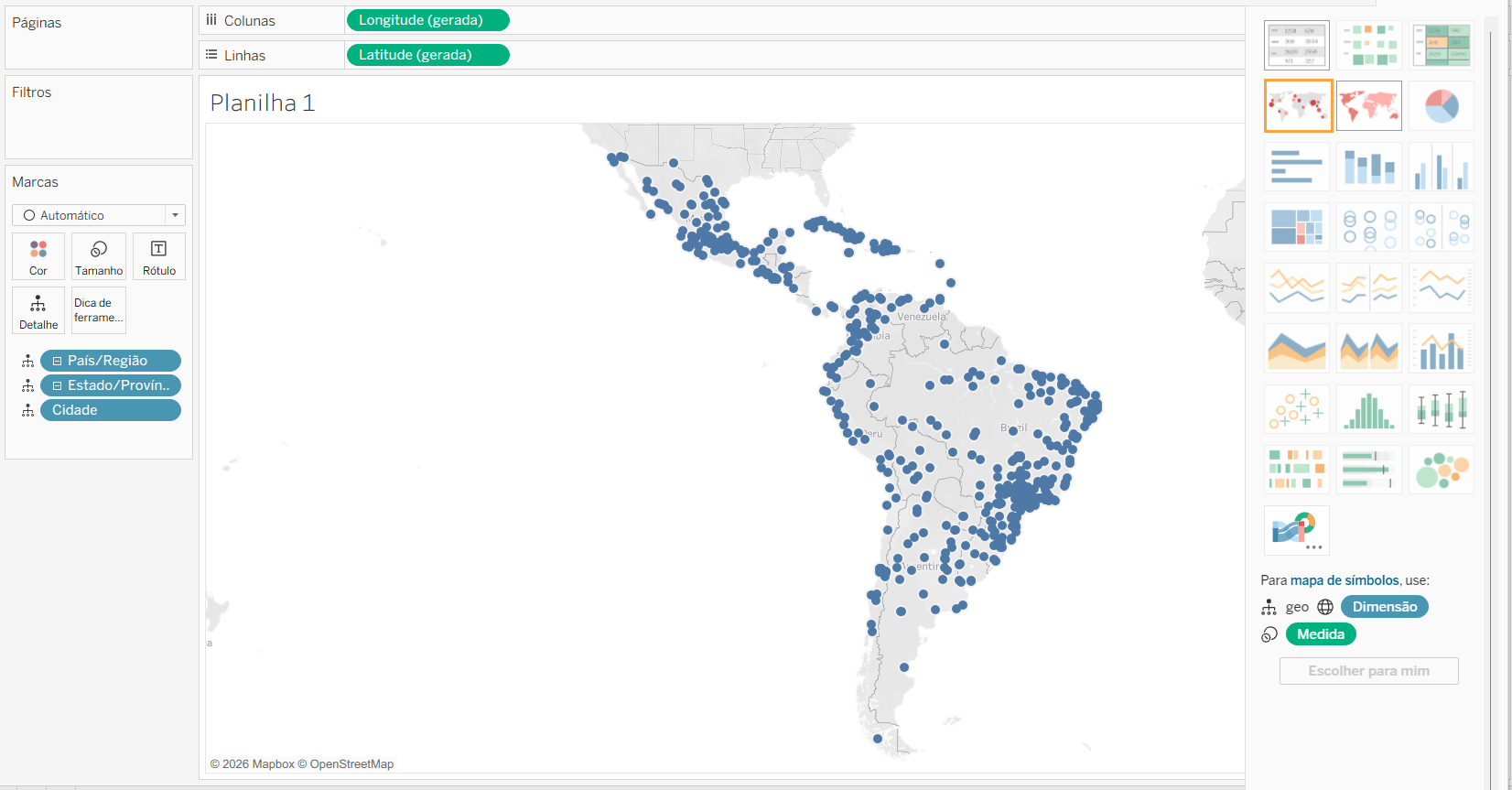 Observe que o Tableau cria automaticamente uma visualização usando os campos da sua fonte de dados. É possível arrastar campos para a visualização para refinar ainda mais a exibição. Neste exemplo vamos fechar a hierarquia de Cidade que está em Detalhe, filtrar somente Brasil como País e adicionar a medida Vendas a Tamanho e Cor.
