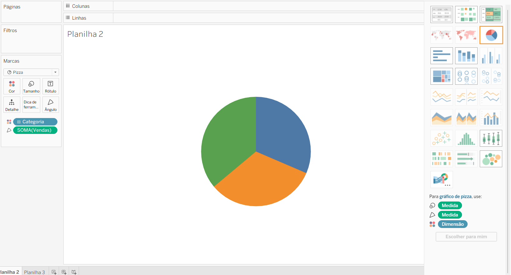 Em uma nova planilha, va até o Mostre-me e clique em gráfico de pizza. Em seguida selecione “Escolher para mim”.