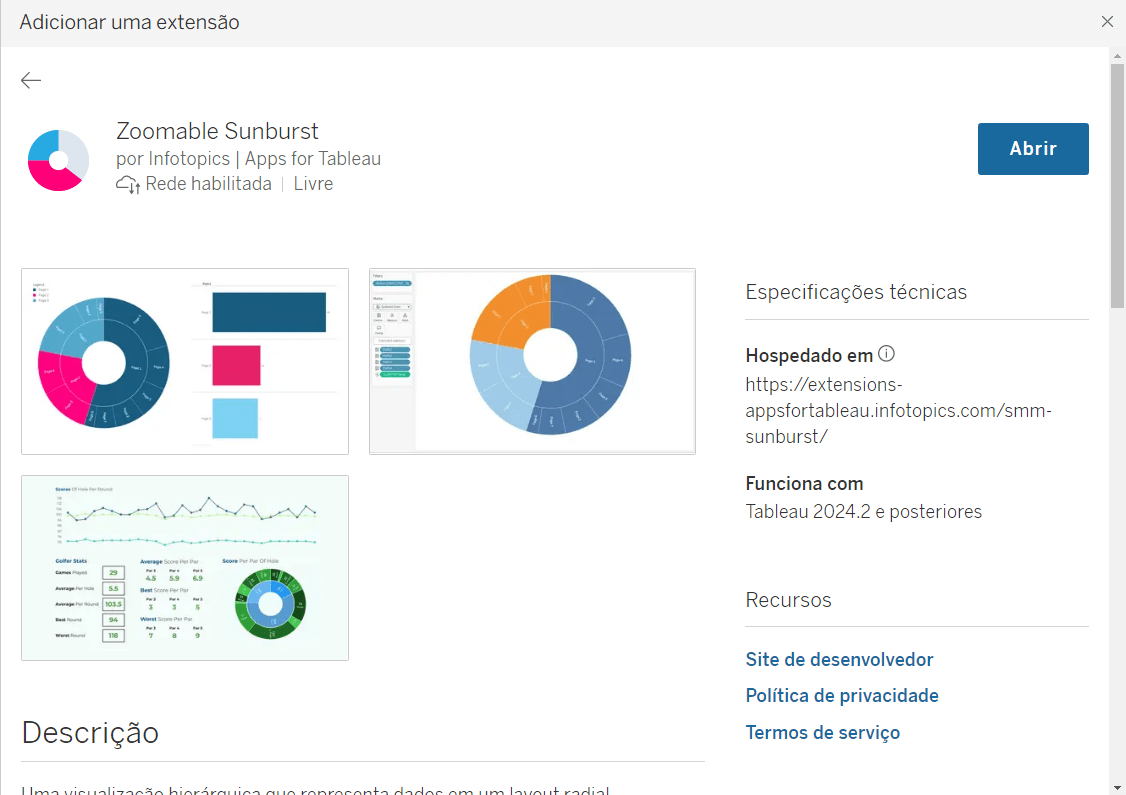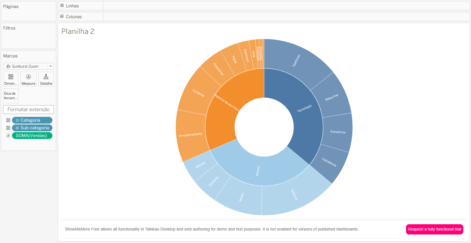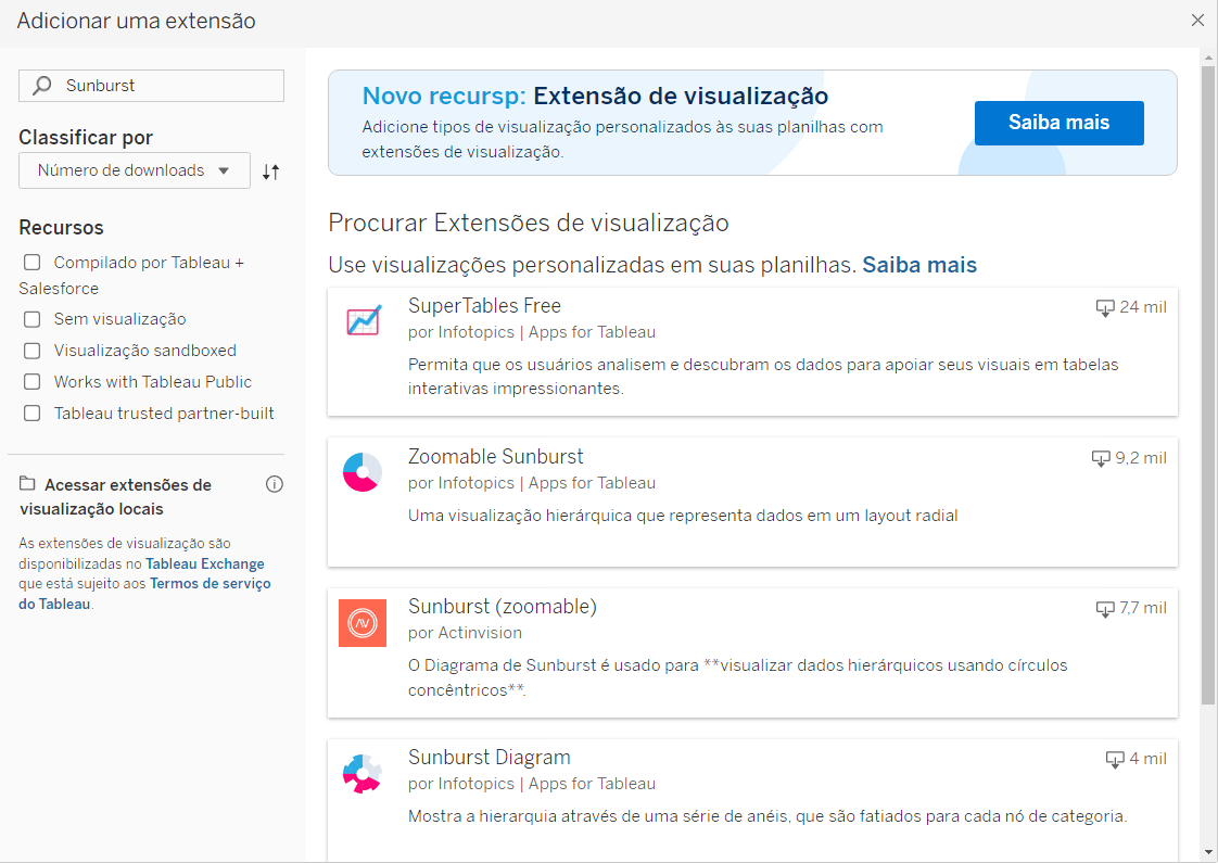 Va novamente no Mostre-me e selecione a opção de extensões. Na janela de extensões, busque por “Sunburst” e escolha uma opção. Clique em Abrir. Agora basta formatar a extensão. Vendas deve estar no cartão de marcas de Measure e Categoria e Sub-categoria em Dimension.