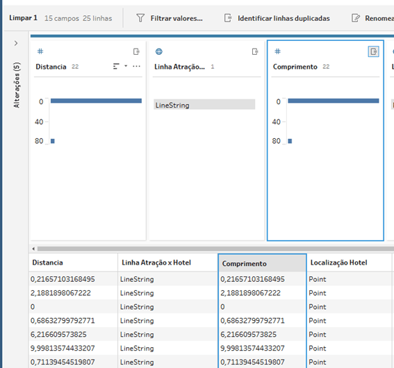 Perceba que no nosso exemplo, os valores ficaram iguais, porque no Distance utilizamos os pontos espaciais de hotel e atração, e já no Length, utilizamos a linha criada no exemplo 1, que é justamente a distância entre os 2 pontos.