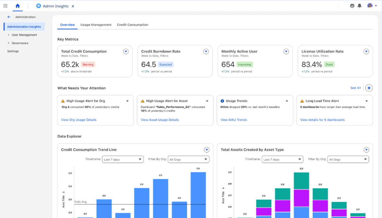 Otimize a adoção de conteúdo analítico, o engajamento do usuário e o consumo com insights pré-construídos para administradores. Esta funcionalidade beta permite passar de uma adoção de análise reativa para proativa com um dashboard unificado que consolida o uso de conteúdo, o engajamento do usuário e os insights de consumo. Identifique rapidamente ativos subutilizados ou ineficiências para otimizar o desempenho com recomendações de economia de custos para uma administração aprimorada.