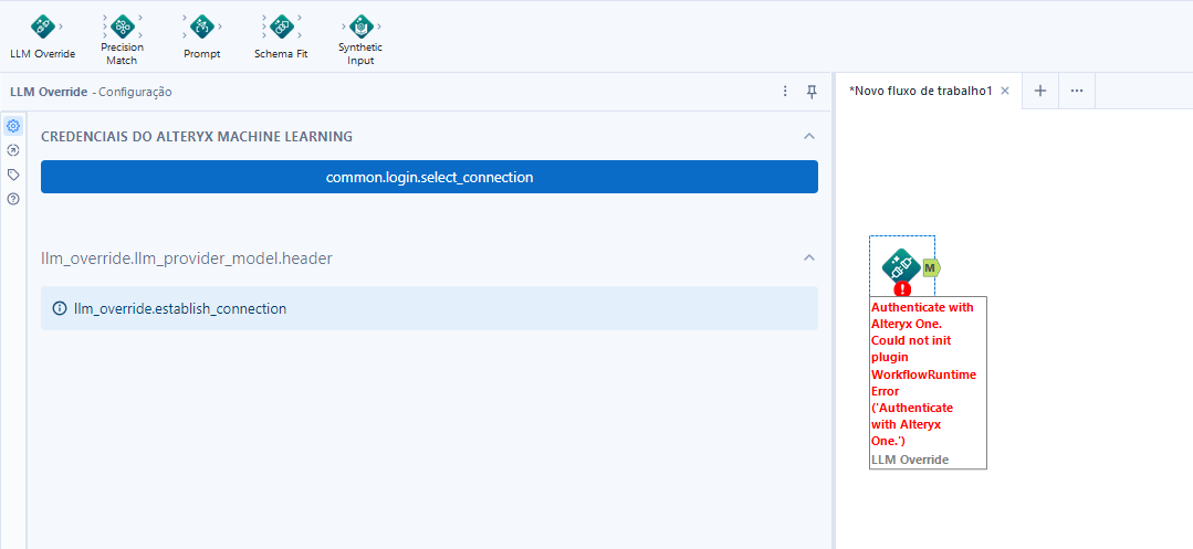 2. Agora, vamos abrir o Alteryx e trazer a ferramenta LLM Override para o fluxo. Na janela Configuração da ferramenta, clique em Selecionar uma conexão para abrir o Gerenciador de conexão de dados.