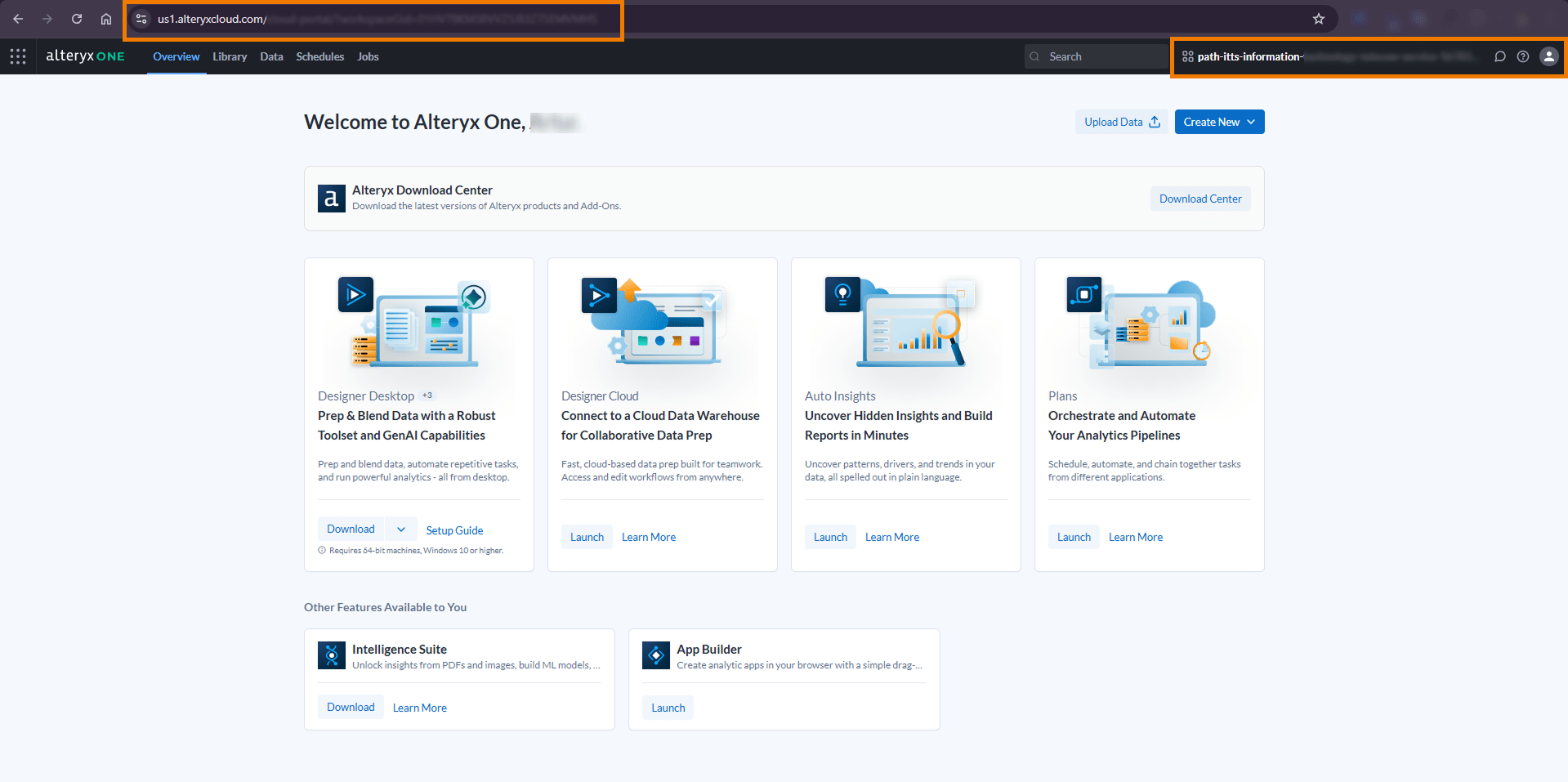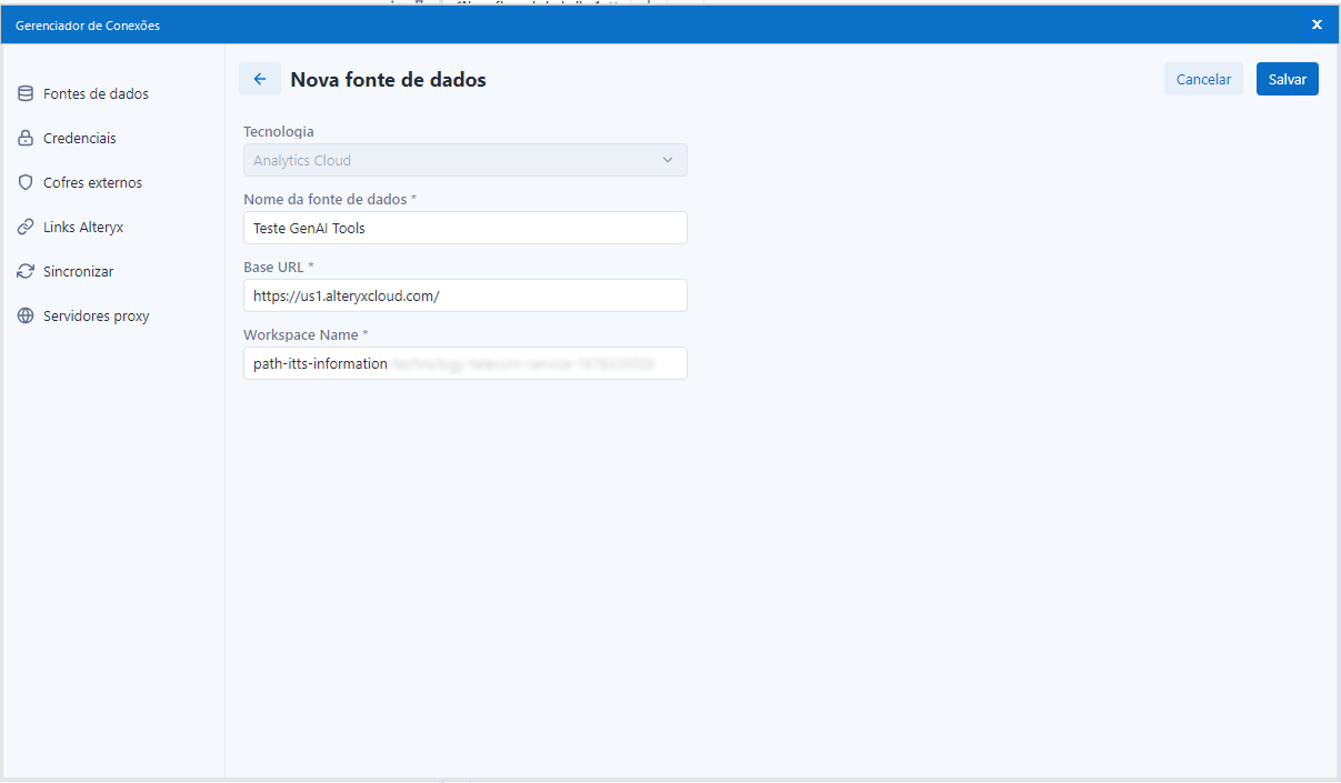 O Base URL vai ser o URL do seu Alteryx One Workspace. O Workspace name pode ser encontrado ao lado da imagem de perfil no canto superior direito: