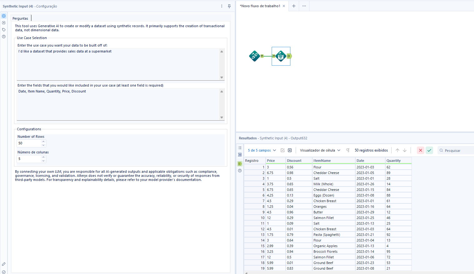 Agora podemos utilizar o modelo escolhido para alimentar as outras ferramentas de GenAI, como a Synthetic Input, que vai gerar uma base de dados baseada no prompt que escrevemos: