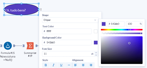 Após clicar nessa ferramenta um balão editável aparecerá no centro do fluxo, dentro desse balão você pode escrever um texto sem limites de tamanho, contendo números, letras e caracteres especiais.