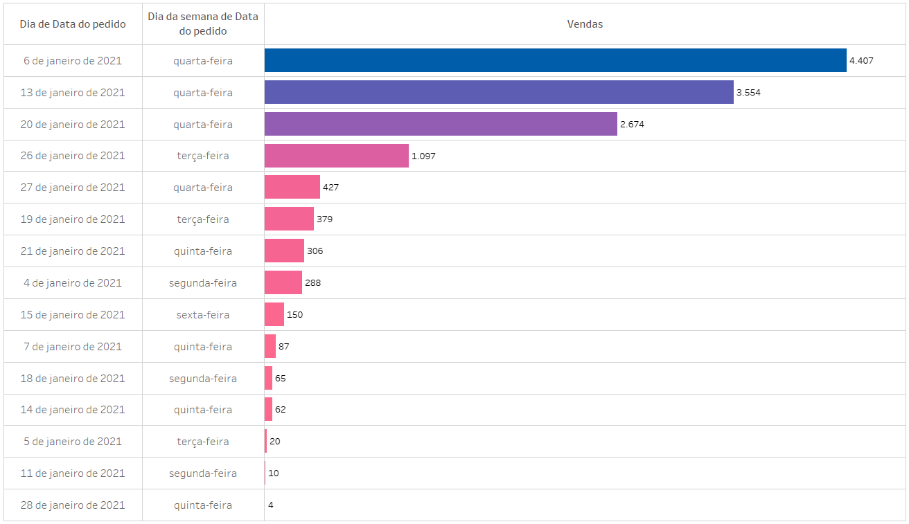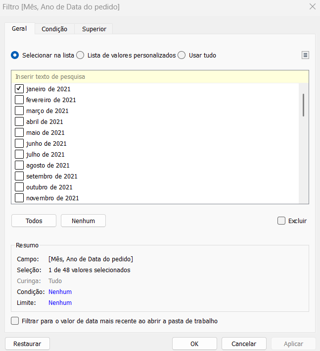 Passo 5: Filtre “Data do pedido” e selecione somente janeiro de 2021 na opção “Mês/Ano” da sessão de filtro para conseguirmos ver o resultado em “exibição inteira” na barra de ferramentas.