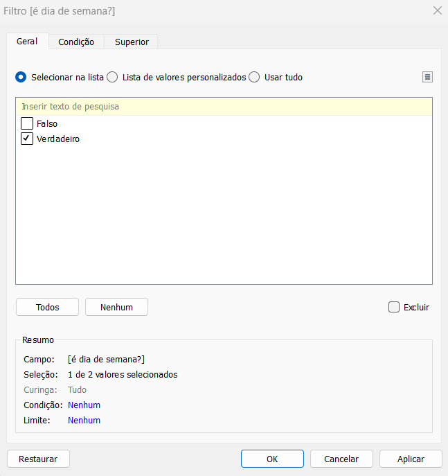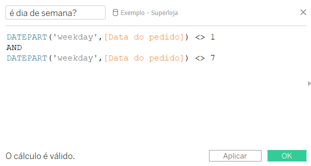 Passo 4: Crie o campo calculado “é dia de semana?” com a lógica de dias de semana serem diferentes de sábado e domingo. Arraste esse campo calculado para o filtro, selecionando a opção “Verdadeiro”.
